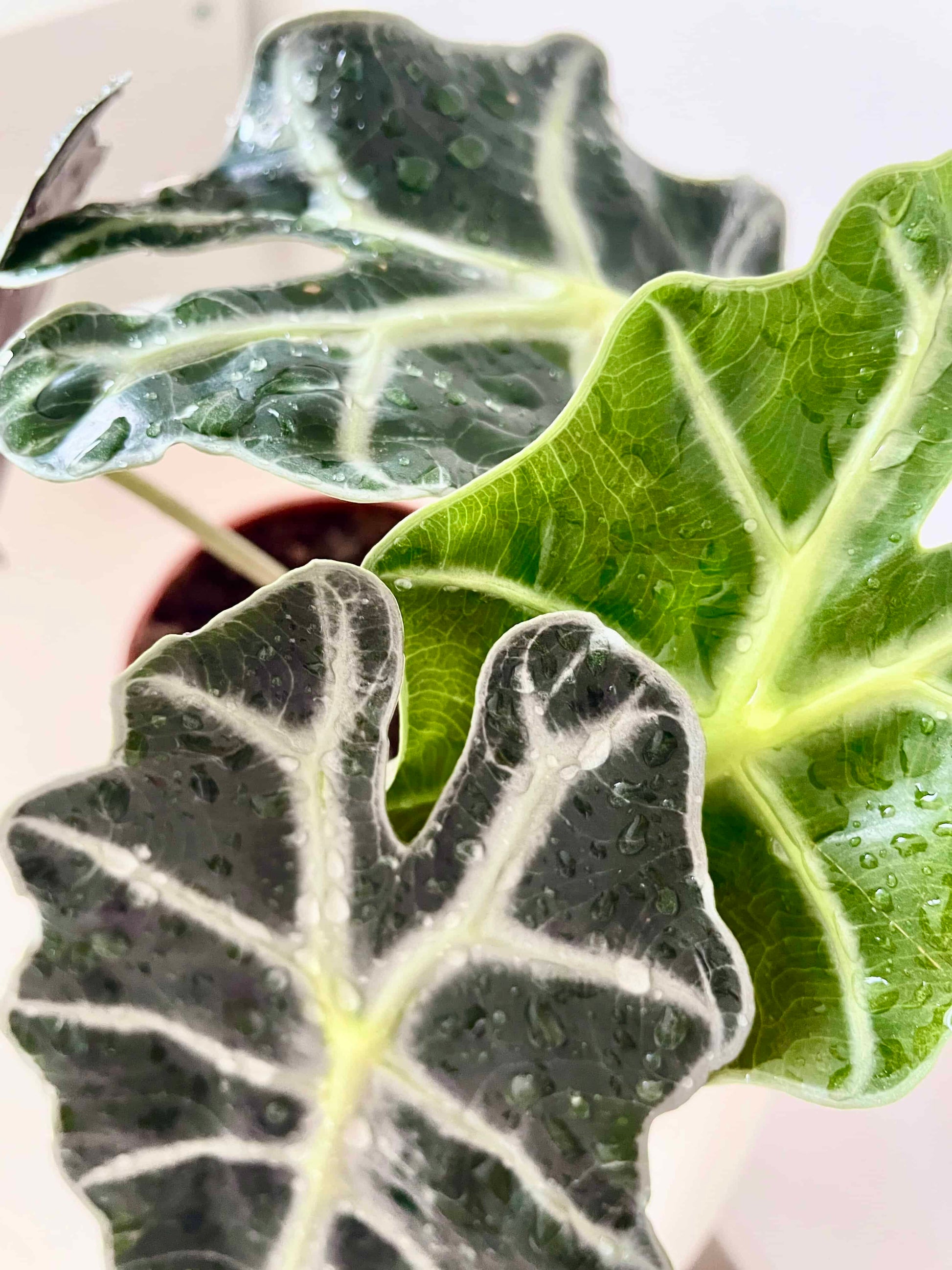 Alocasia 'Amazonica', also known as African Mask Plant or Elephant's Ear, features striking arrowhead-shaped leaves with deep green tones and bold, silvery-white veins. Its dramatic, sculptural look makes it a standout in any indoor plant collection.